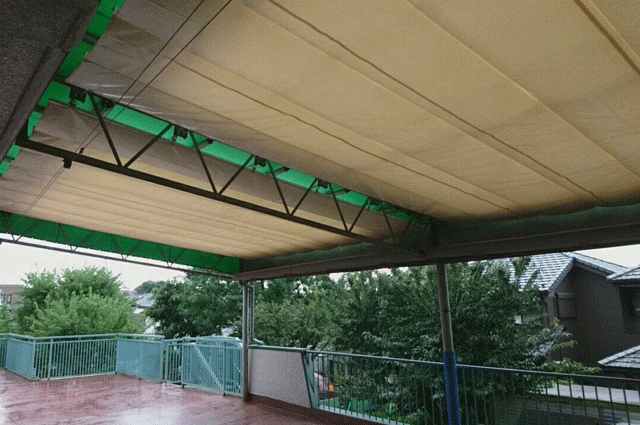 幼稚園プールの天井部分に設置されている、開閉式テント(パーゴラ)の張替えをしました。生地はパワーシートを使用。