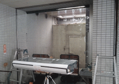 (シート加工品・のれんカーテン・スライドカーテン)製品: ビニールカーテン , のれんカーテン , ビニールシート加工品 , 大型カーテンレール 地域: 東京都立川市 業種: 修理工場 用途: 物品の移動が多いためのれん式スライドカーテンで間仕切り