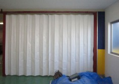 (ジャバラビニールカーテン+大型カーテンレール)製品: ジャバラビニールカーテン , 大型カーテンレール 地域: 愛知県安城市 業種: 自動車部品製造業 用途: 工場入口の間仕切りビニールカーテン
